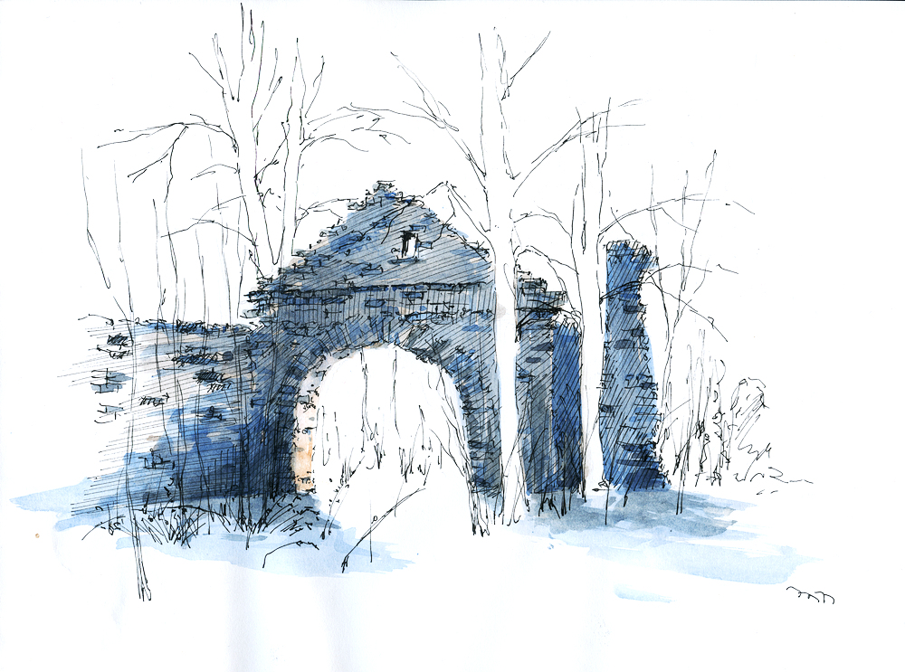 Obrázky z Opavských Sudet teď rychle přibývají. Každý den aspoň jeden. Pro začátek další, ne moc povedený, pokus o akvarel. Poprvé jsem zkoušel použít místo štětce houbičku na nádobí: